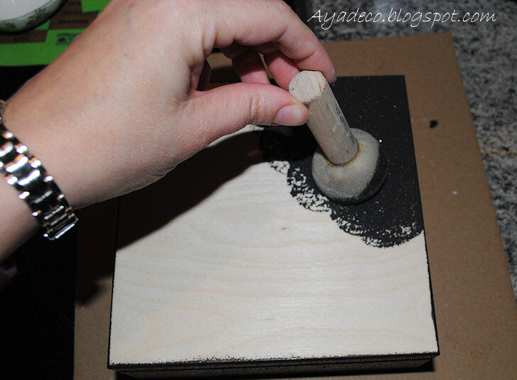 Pudełko malujemy ciemną farbą - brąz, czarny lub grafit. Zaczynamy od boków, następnie pokrywany wieko, w ten sposób pomalujemy całe pudełko na raz. Najlepiej użyć gąbki do tapowania, w ten sposób farba idealnie się rozprowadza i nie pozostawia smug.
